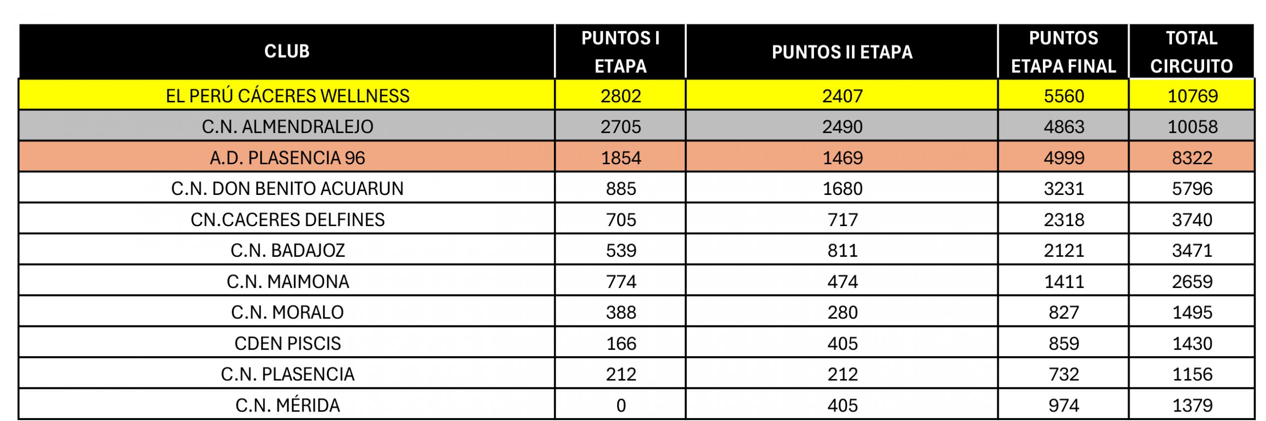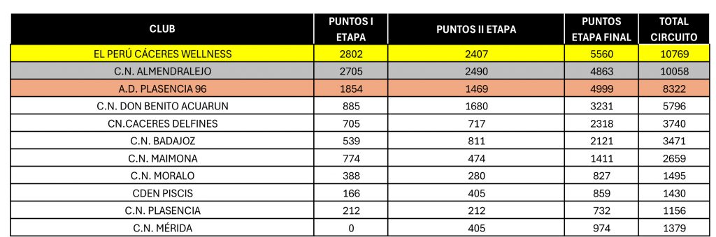 En la clasificación general, el triunfo correspondió a El Perú Cáceres Wellness, que se alzó con el primer puesto tras una actuación memorable y constante en las tres etapas. La segunda posición fue para el C.N. Almendralejo, que demostró un alto nivel competitivo y gran regularidad durante todo el campeonato.
