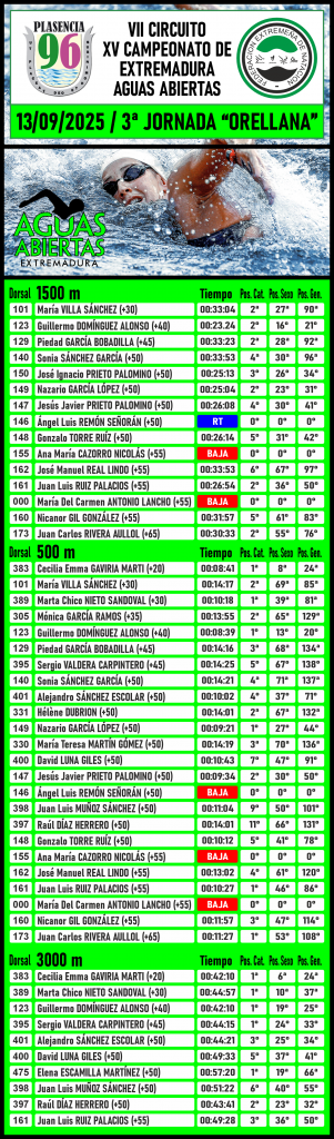 La A.D. Plasencia 96 sigue demostrando constancia y compromiso en el VII Circuito XV Campeonato de Extremadura de Aguas Abiertas2025. Con las últimas clasificaciones ya publicadas por la FEN, nos mantenemos en una sólida tercera posición por clubes, con una diferencia significativa respecto al cuarto clasificado, el C.N. Don Benito Acuarun. Un logro que cobra aún más valor si consideramos que somos un club compuesto exclusivamente por nadadores máster, compitiendo de tú a tú contra clubes que combinan categorías de natación pura y máster.