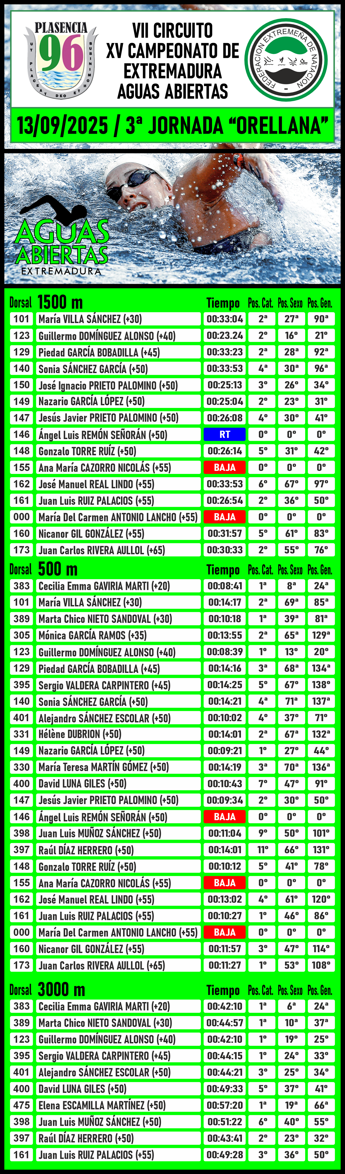 La jornada arrancó con la prueba de 1500 metros, donde los y las atletas máster se lanzaron al agua en los primeros turnos. Nazario García López fue el más rápido del equipo, logrando un tiempo de 25:44 y alcanzando la 23ª posición general (1º en categoría +50). Le siguieron Ángel Luis Remón Señorán (27:06, 29º general, 2º en +50), Jesús Javier Prieto Palomino (27:30, 30º), y David Luna Giles (31:45, 55º). Entre los veteranos, José Manuel Real Lindo logró un meritorio 66º lugar general (3º en +55), y Nicanor Gil González, con 32:24, terminó en la 57ª posición general (2º en +55). En categoría femenina, Sonia Sánchez García volvió a brillar con una gran marca de 36:22, quedando 68ª en la general y 1ª en +50, mientras que Piedad García Bobadilla fue 61ª general y 2ª en +45. Hélène Dubrion, por su parte, causó baja en esta ocasión.