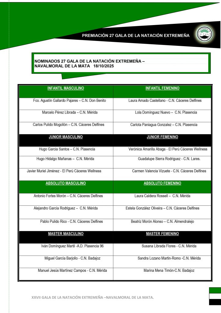 El próximo 18 de Octubre se celebra la 27 GALA DE LA NATACIÓN EXTREMEÑA DE NATACIÓN en la ciudad de Navalmoral de la Mata a las 11,15 Horas en Teatro del Mercado, donde todos los nadadores nominados así como los integrantes de la Selección Extremeña en Campeonatos de España por Comunidades Autónomas, (Deportistas, Técnicos y Delegados), están invitados al coctel, que tendrá lugar una vez finalizado el acto, en las Carpas de Baram.