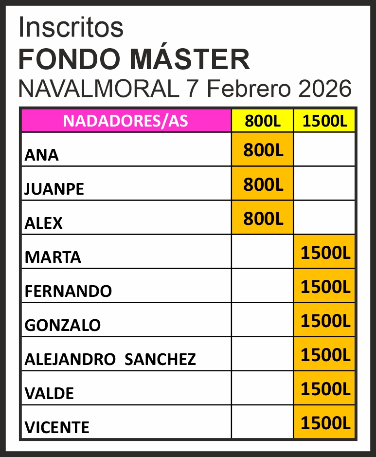 El próximo sábado día 7 de febrero en Navalmoral de la Mata, en única sesión de tarde se celebra el VIII Fondo Máster de Extremadura. Un total de 9 clubes extremeños se darán cita en esta jornada para el disfrute de los fondistas de nuestra región. 48 nadadores será en numero total de participación, 33 chicos y 15 chicas, de los cuales, 9 serán de nuestro equipo.