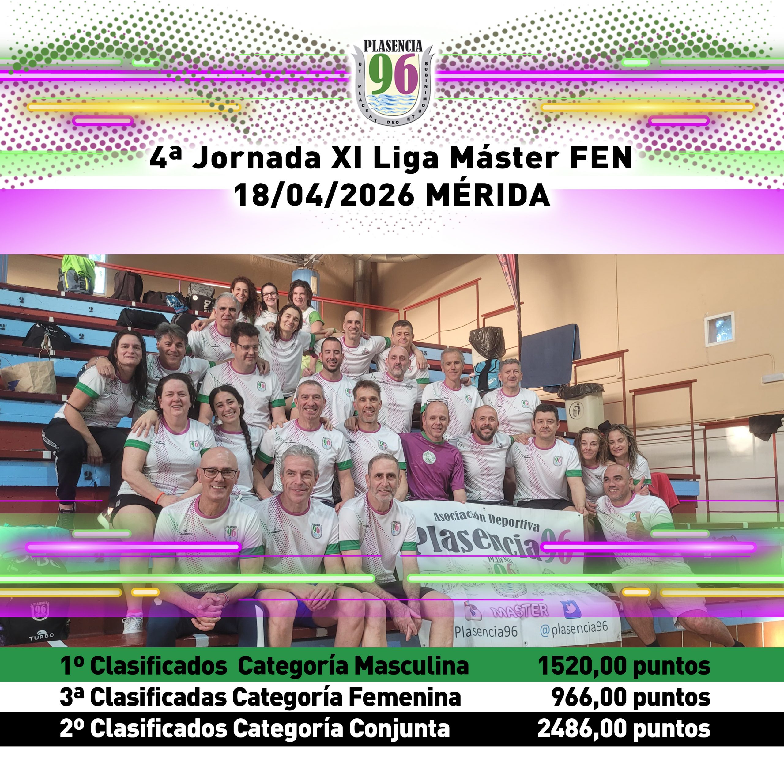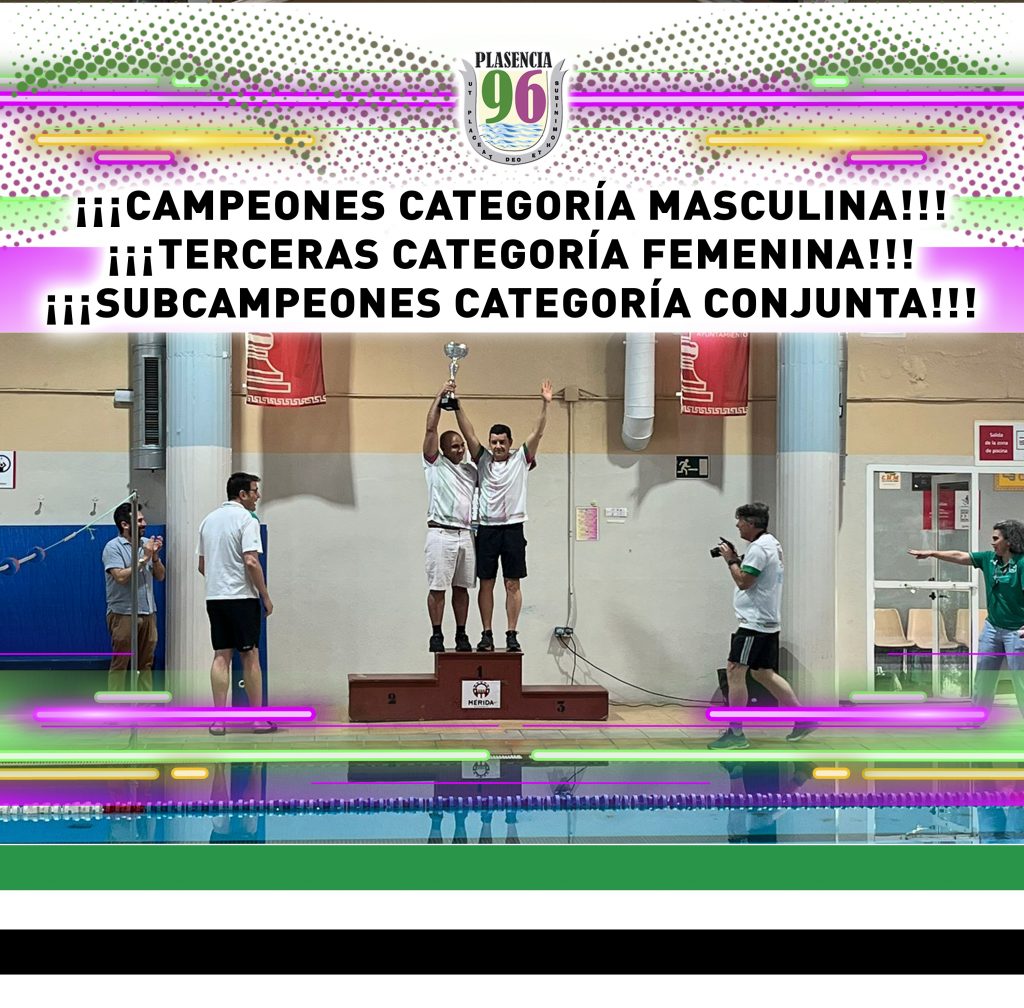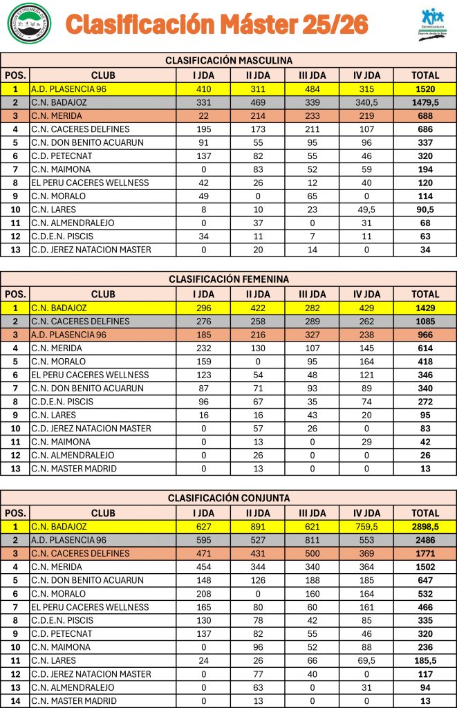 En la tarde del pasado sábado, la A.D. Plasencia 96 se proclamó campeona de la clasificación conjunta absoluta con 1.344 puntos, aventajando por un margen mínimo al C.N. Badajoz, segundo con 1.339, mientras que el C.N. Cáceres Delfines completó el podio con 829 puntos. Un desenlace decidido por pequeños detalles, vivido con máxima intensidad hasta el último relevo, que convirtió la competición en una auténtica celebración de la natación máster.