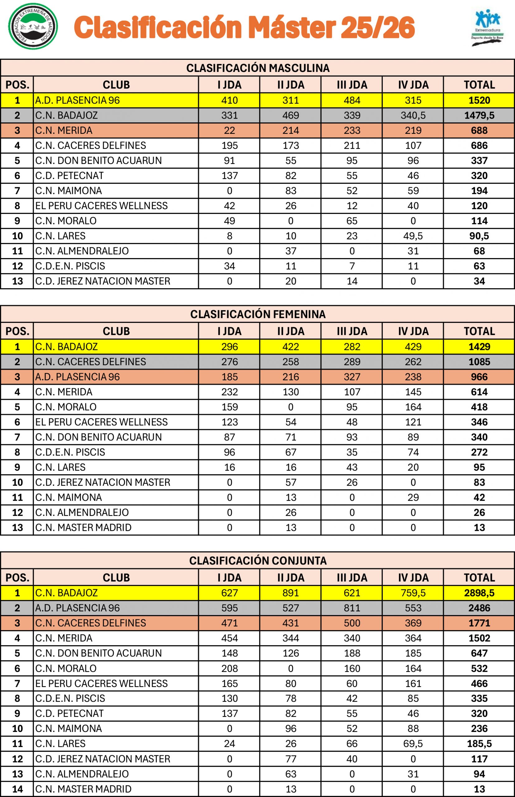 Una vez disputadas las dos primeras jornadas, el Club Natación Badajoz lidera todas las categorías. Así queda la clasificación por clubes antes de la celebración de esta tercera jornada: