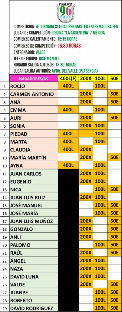 A.D. Plasencia 96 será el equipo con mayor participación en esta jornada, un total de once nadadores, de los cuales cuatro chicas y siete chicos que indicamos a continuación: